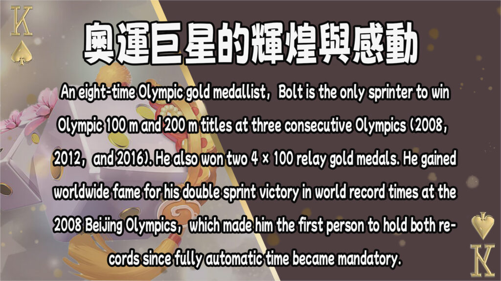 • 成就: Usain Bolt 是田徑史上最偉大的運動員之一,擁有多項奧運金牌和世界紀錄。他最著名的成就是在2008年北京奧運會、2012年倫敦奧運會和2016年里約奧運會連續三屆贏得男子100米、200米和4×100米接力比賽金牌,創下了無與倫比的壯舉。