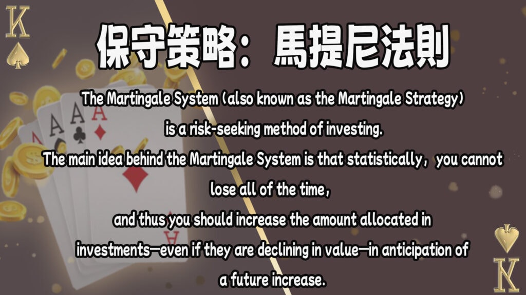 對於新手玩家來說,使用保守的策略是降低風險的一種明智選擇,而馬提尼法則(Martingale System)是一個廣泛使用且適合新手的策略。這種策略的核心思想非常簡單,即在每次輸掉一輪賭局後,您將加倍下注金額,以期望在下一輪中贏得足夠的錢來彌補之前的損失,並實現利潤。這使得馬提尼法則特別適合那些希望快速恢復損失的玩家。