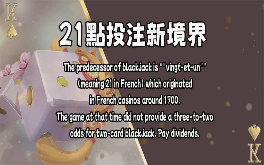 Blackjack was not popular in the United States at first, so casinos tried to offer various additional bonuses to attract gamblers to participate in the game. One of the additional bonuses is that when the player has both the Ace of Spades and the Black Jack (either Jack of Spades or Jack of Clubs), the bonus will be doubled. Such a card is called “black jack” (blackjack, blackjack), and this name gradually became the name of the American version of the blackjack game. Even after the extra bonus rule was discontinued, the name “black jack” remained continue to exist. With the development of the rules today, “blackjack” no longer necessarily needs to contain J or black cards.(資料來源 )